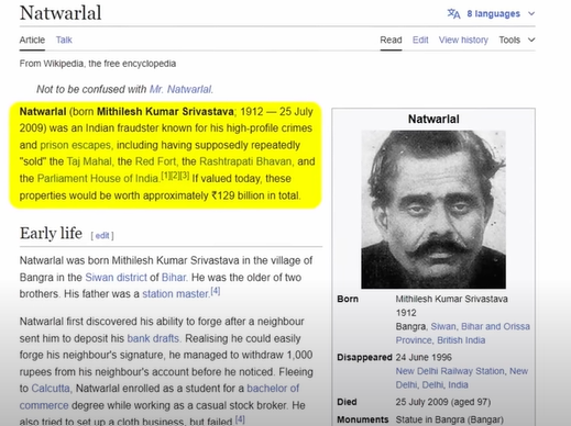At that time, people outside did not have that much knowledge and actually Natwar Lal was an expert in one thing and that was copying any sign. If you search about Natwar Lal in Google, then the first information you will see is that he had sold the Rashtrapati Bhavan, the Taj Mahal and all of them. Its value is in billions. So, by copying signs, he did all these things.